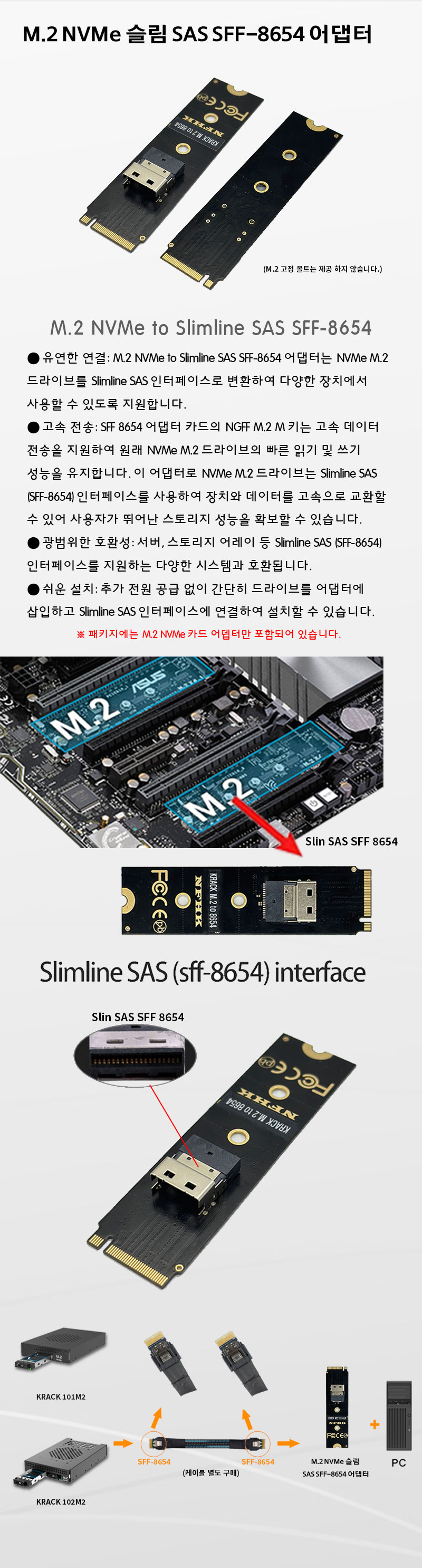 K-RACK M.2 to SFF8654 Nvme 어댑터 PCIe 메인보드 M.2 슬롯 장착용 slimSAS 4i