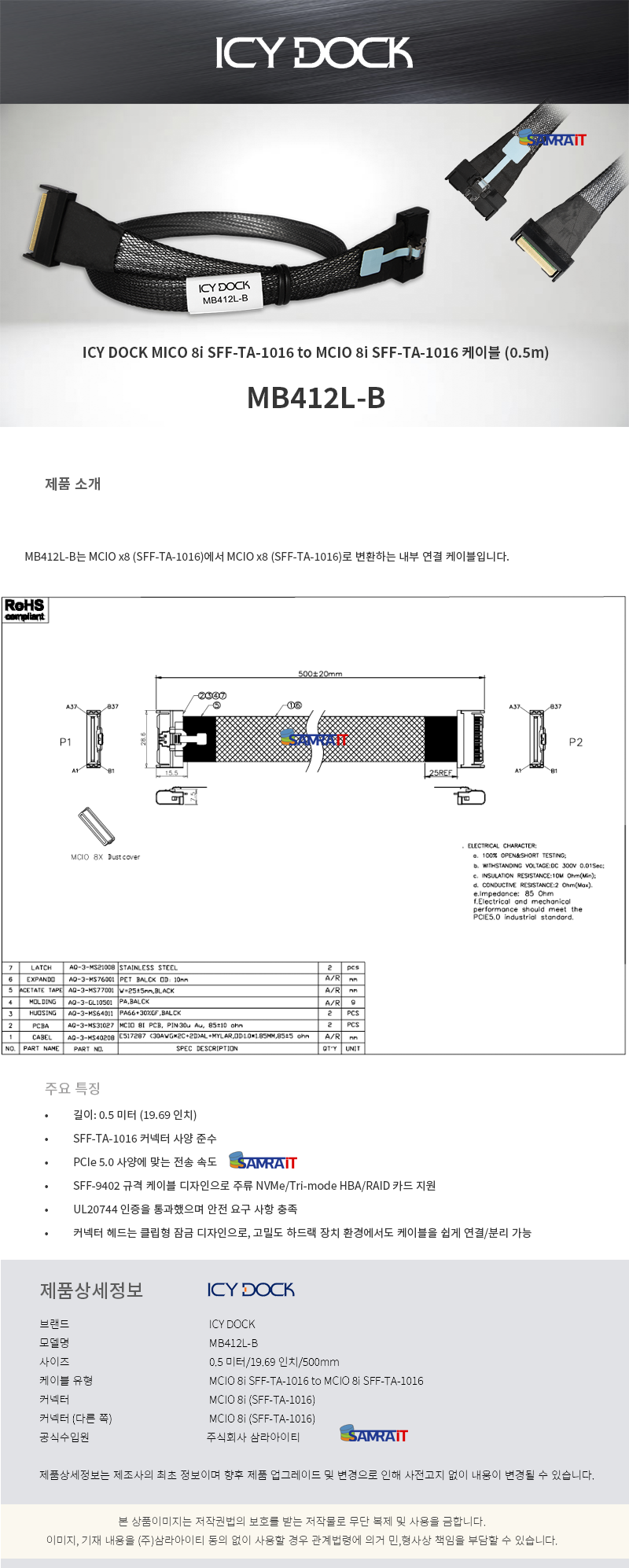 ICY DOCK MB412L-B MCIO 8i SFF-TA-1016 to MCIO 8i SFF-TA-1016 케이블 (0.5m)