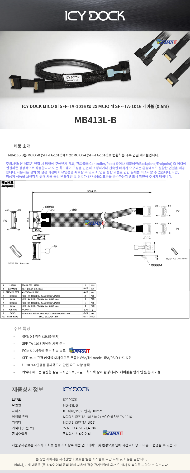 ICY DOCK MB413L-B MCIO 8i SFF-TA-1016 to 2x MCIO 4i SFF-TA-1016 케이블 (0.5m)