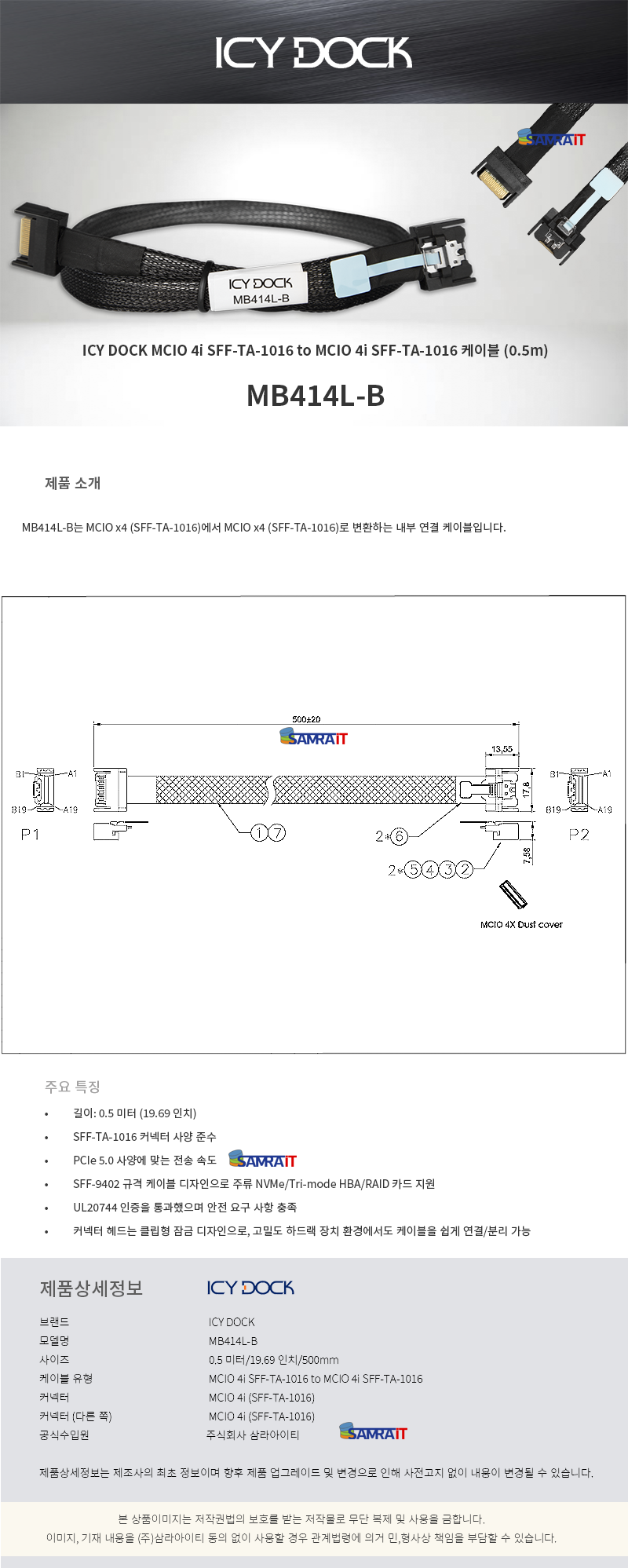 ICY DOCK MB414L-B MCIO 4i SFF-TA-1016 to MCIO 4i SFF-TA-1016 케이블 (0.5m)